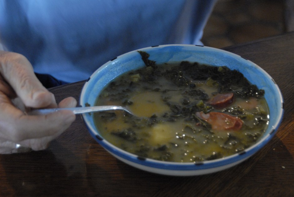 Regional versions of caldo verde are served all over Portugal. The soup is made with a dark green cabbage called couve which is not found here. We substitute kale.
