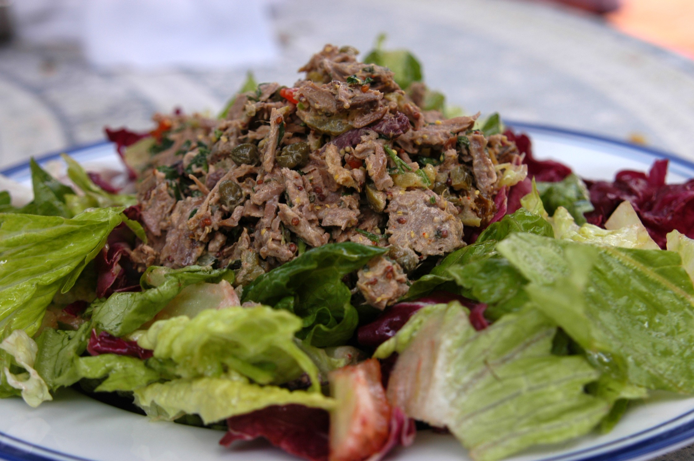 Probably German inspired, in my neighborhood we made meat salad with left over roasts and soup meats and we called it “Ropa Vieja” which means “Old Clothes” in Spanish (pronounced Rope-ah Vee-a-ha). Later, when we lived in Würzburg, Germany, we often had lunch at the Weinstein Restaurant overlooking the city where they offered a great “Fleisch salat”(meat salad in German). It was never made the same way twice either at the restaurant or in my neighborhood.