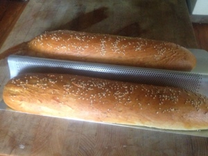 This recipe can be divided in two after the second rising. Cut the ball in two and gently roll the dough on a floured surface to make a log. Place on a parchment covered baking sheet with corn meal sprinkled on it or even better with a specialty pan to make “Italian Bread”. These were purchased from the King Arthur Flour web site.