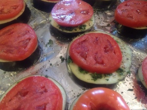 - Place the eggplant slices on the baking sheet and top with garlic and Italian herbs*.