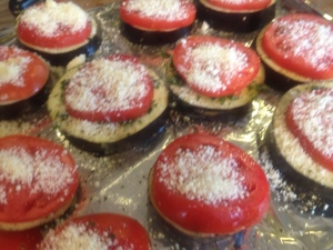 Note: This recipe works as a side dish, or as “bruschete”. If using as bruschete, place each eggplant slice on a round of toasted Italian bread – serve warm or cold.