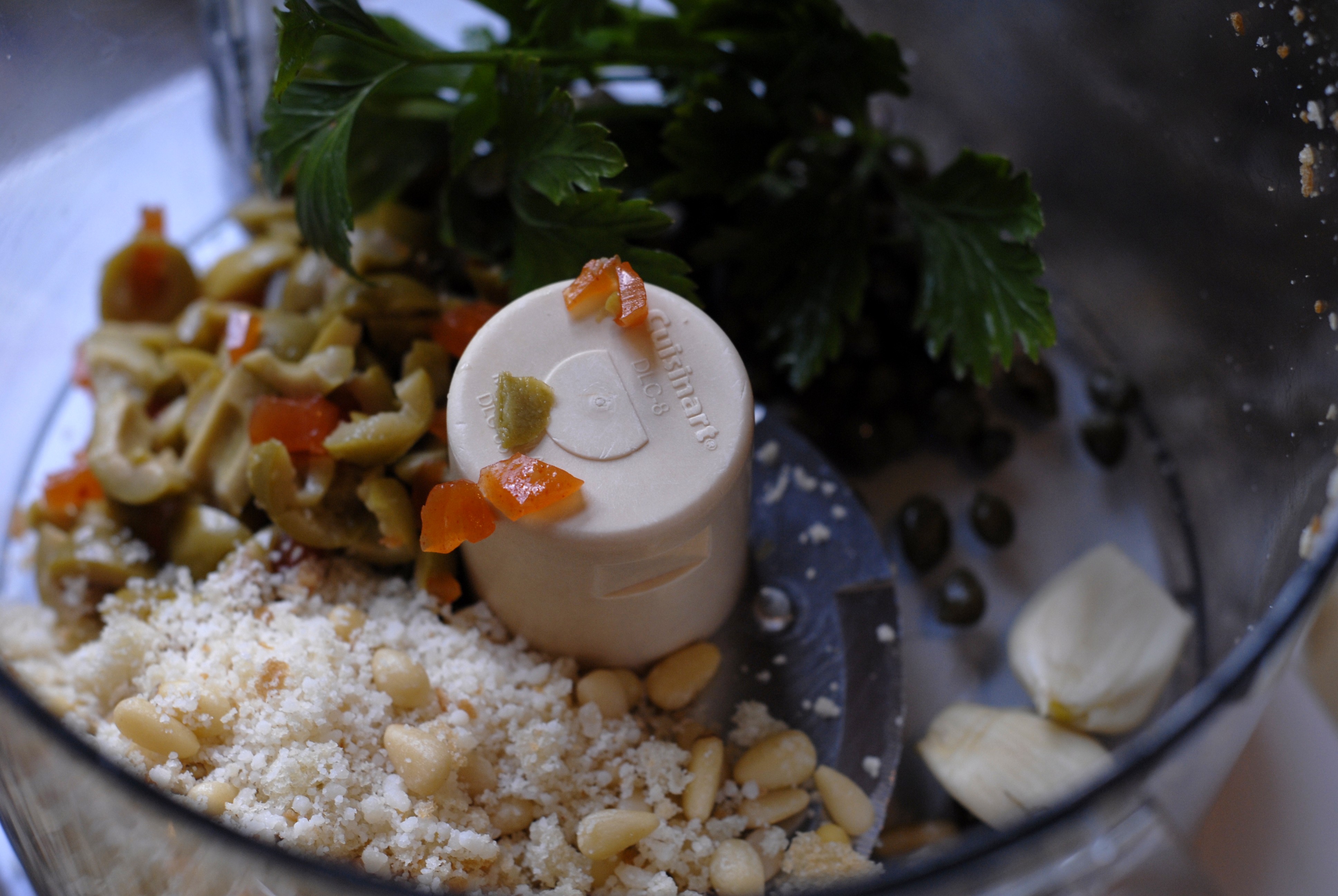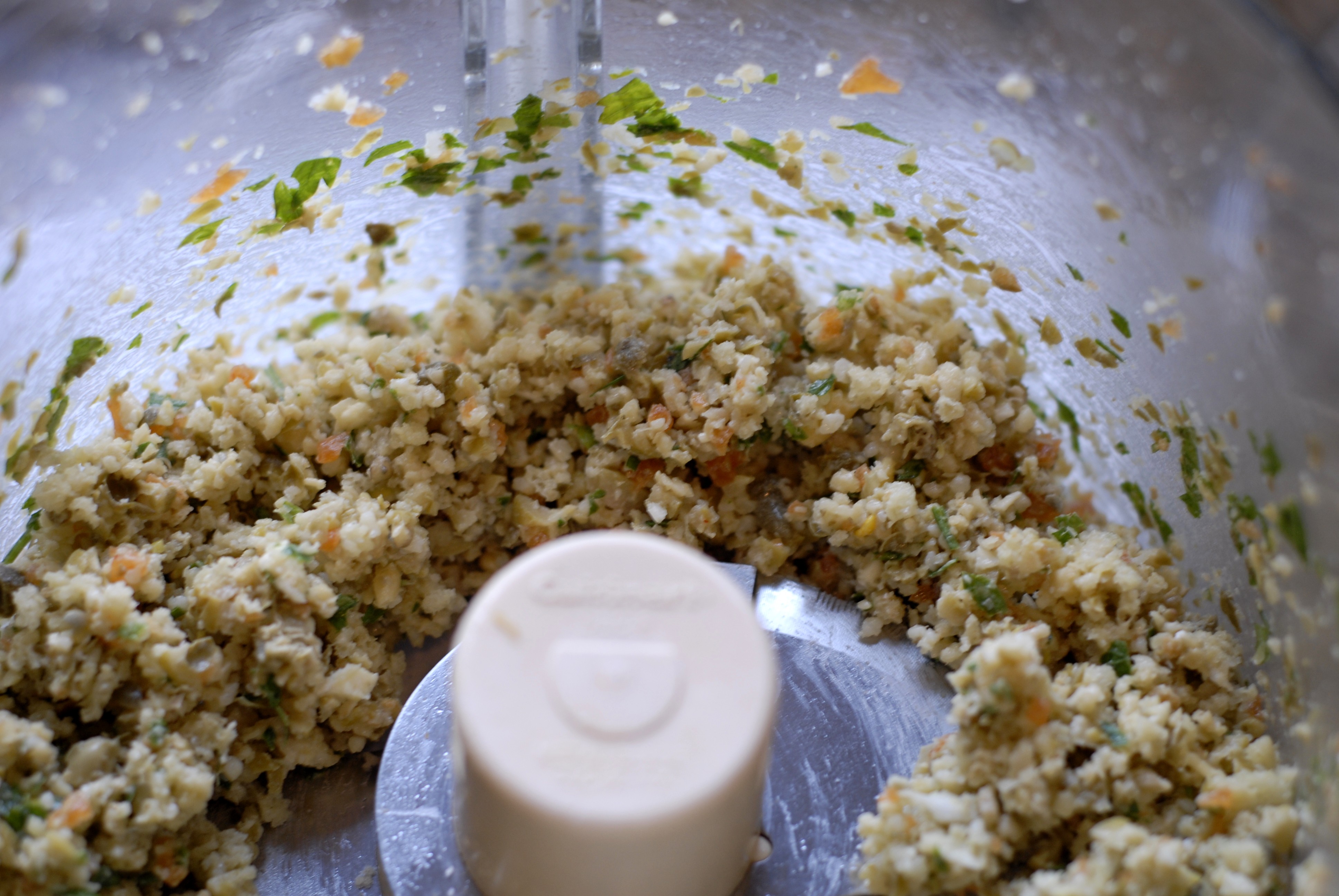 Put the first 7 ingredients into the food processor and pulse several times until all ingredients are chopped and well mixed.