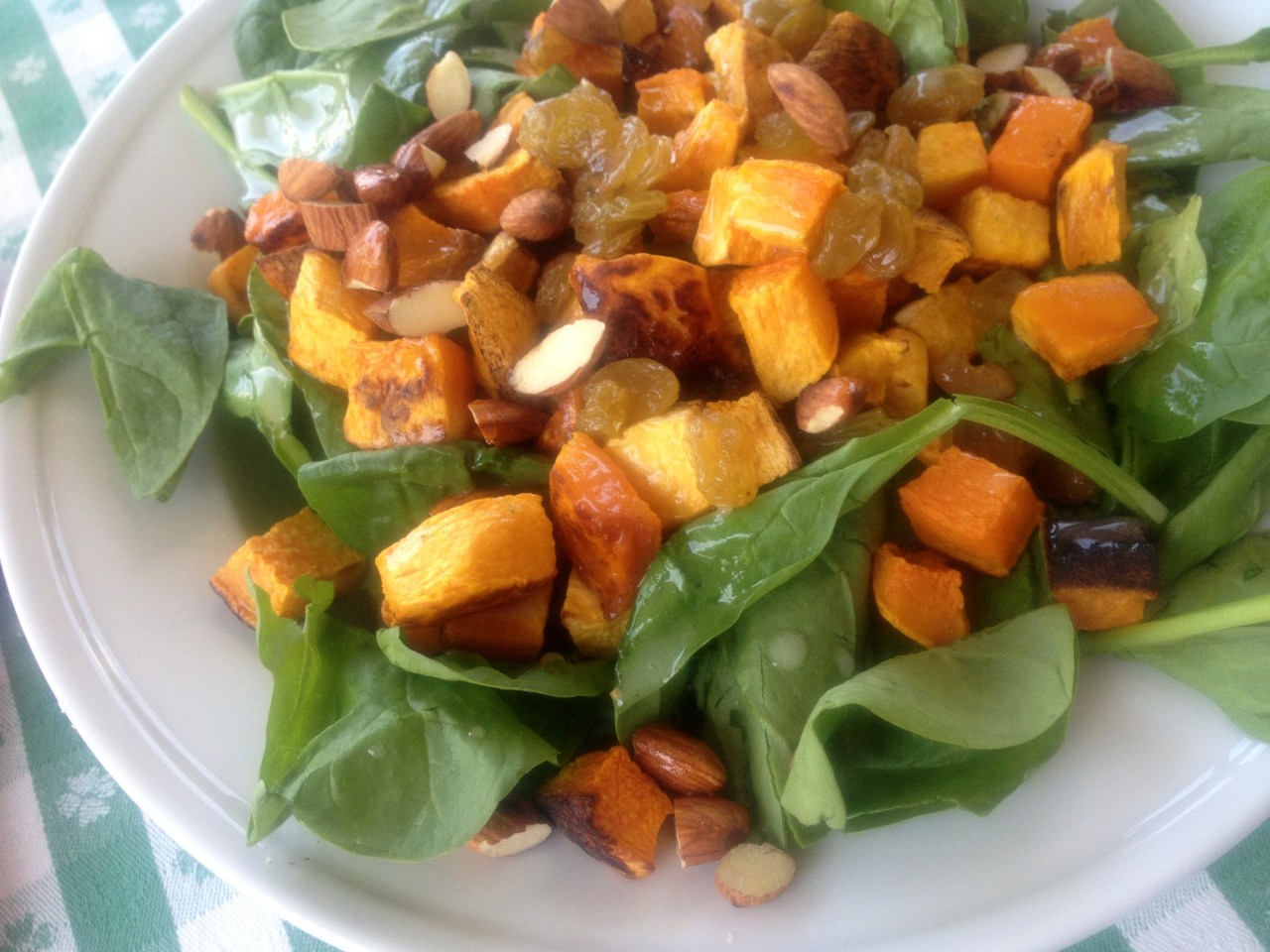 - Arrange of the squash cubes, almonds, and raisins on top of the spinach and serve.