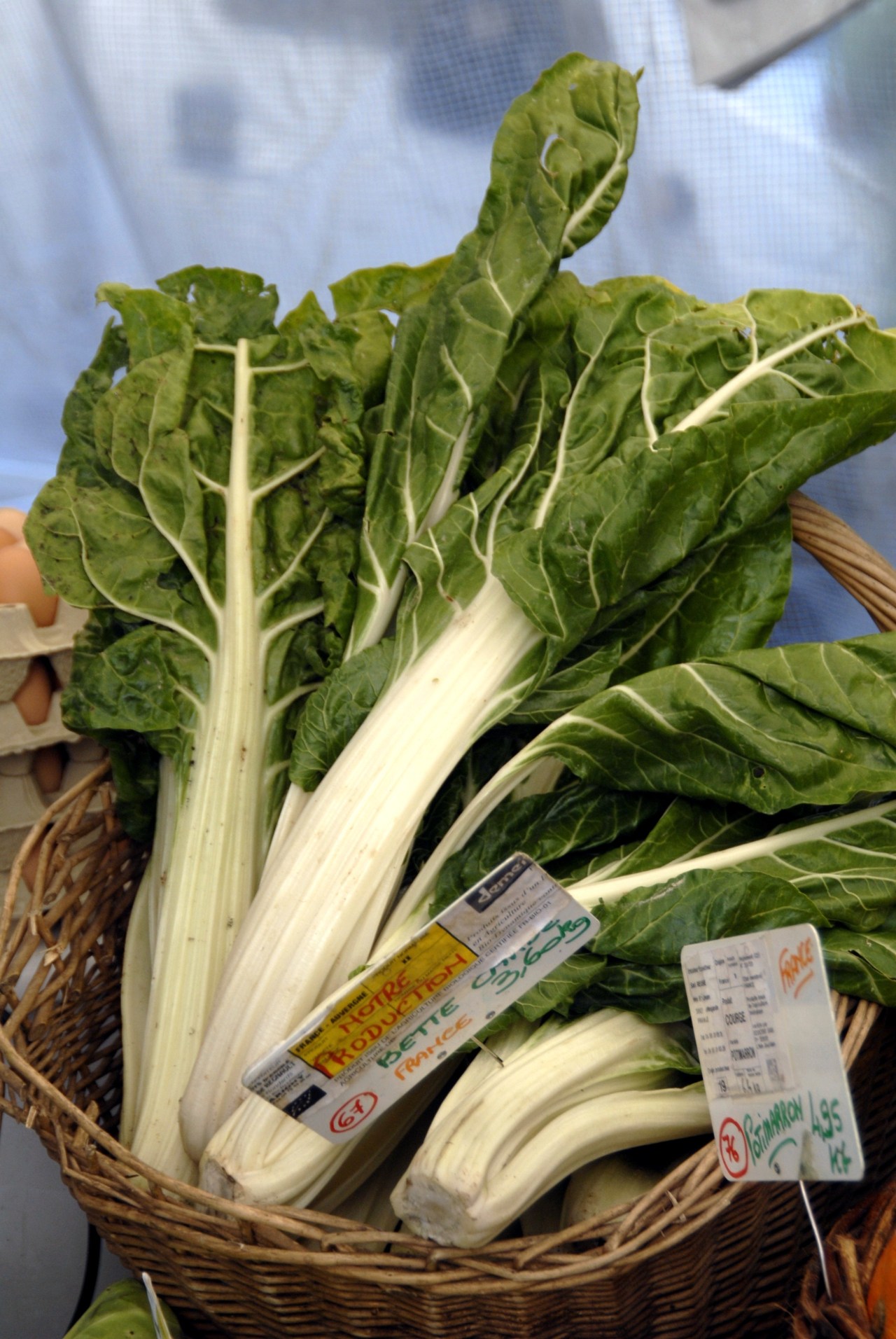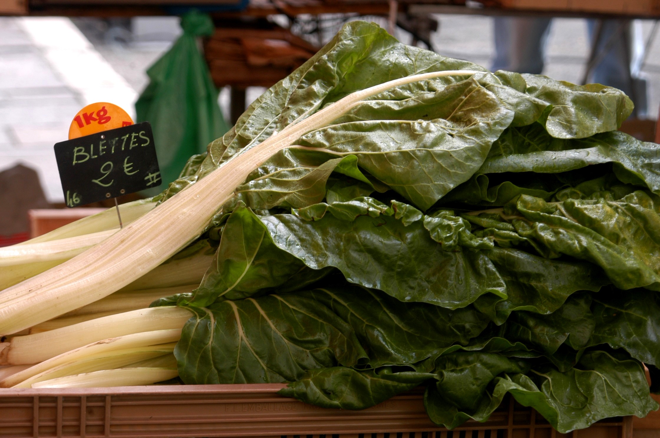 Swiss chard does not come from Switzerland, but a Swiss botanist is responsible for its analysis and thus his country was honored in the name. It, along with spinach, beets, and quinoa, belongs to the goosefoot family, so-called because the leaves of the plants resemble (somewhat) goose feet! Swiss chard is sold in bunches. It needs to be washed with attention because the leaves have deep grooves where sand and grit can hide. Also, as seen in this photograph taken in an organic market in Paris, it has really large, tough stems which I always remove before cooking. Swiss chard, along with kale, collards, and spinach, is full of wonderful nutritional value and it is a strong definite to be included in the diet.