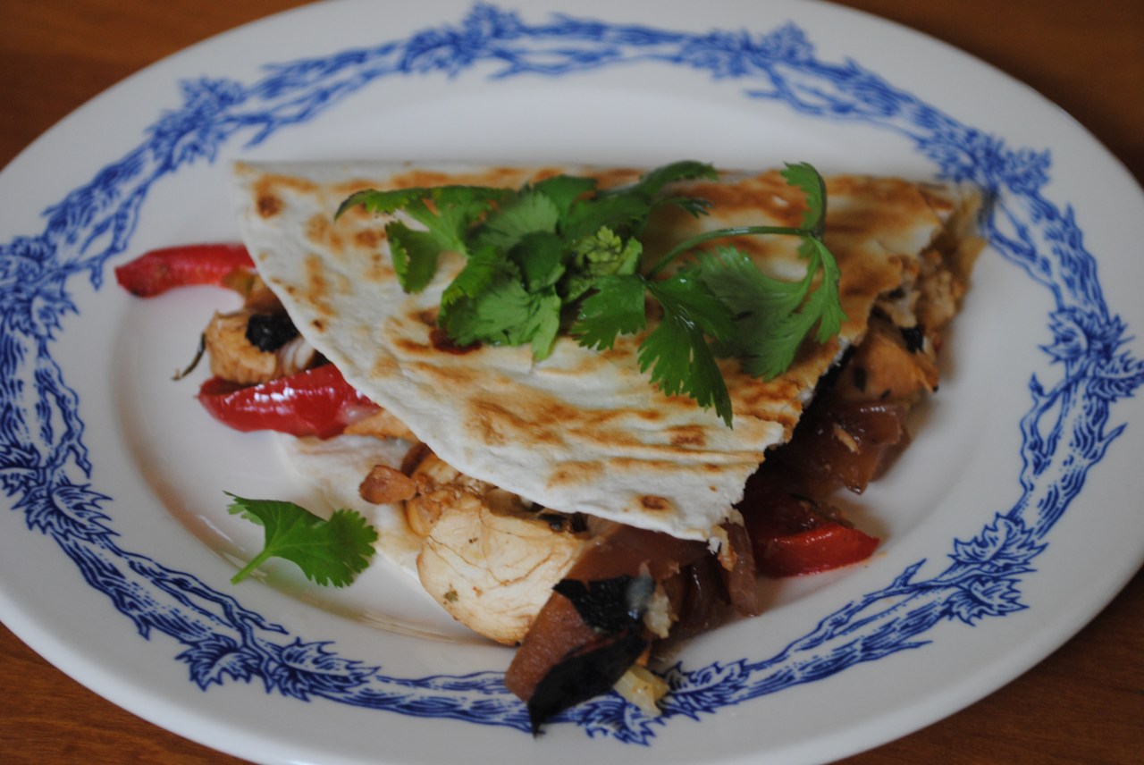 This recipe works well on the grill but can be done on the stove top if you have a large stove-top-grill or flat pan. If preparing inside, tortillas can be heated up by first running them under water for a second then microwaving for 30 seconds to soften them up. The featured picture for this recipe was actually quesadillas made the following day with the filling (I almost think the filling’s better the second day). To make the quesadillas, heat a flat pan over the stove, place a softened tortilla on the pan and layer half with the fajita filling and some shredded cheddar cheese. Fold empty half over the filled half and heat until tortilla begins to brown. Flip tortilla over and heat the alternate side until brown and serve.
