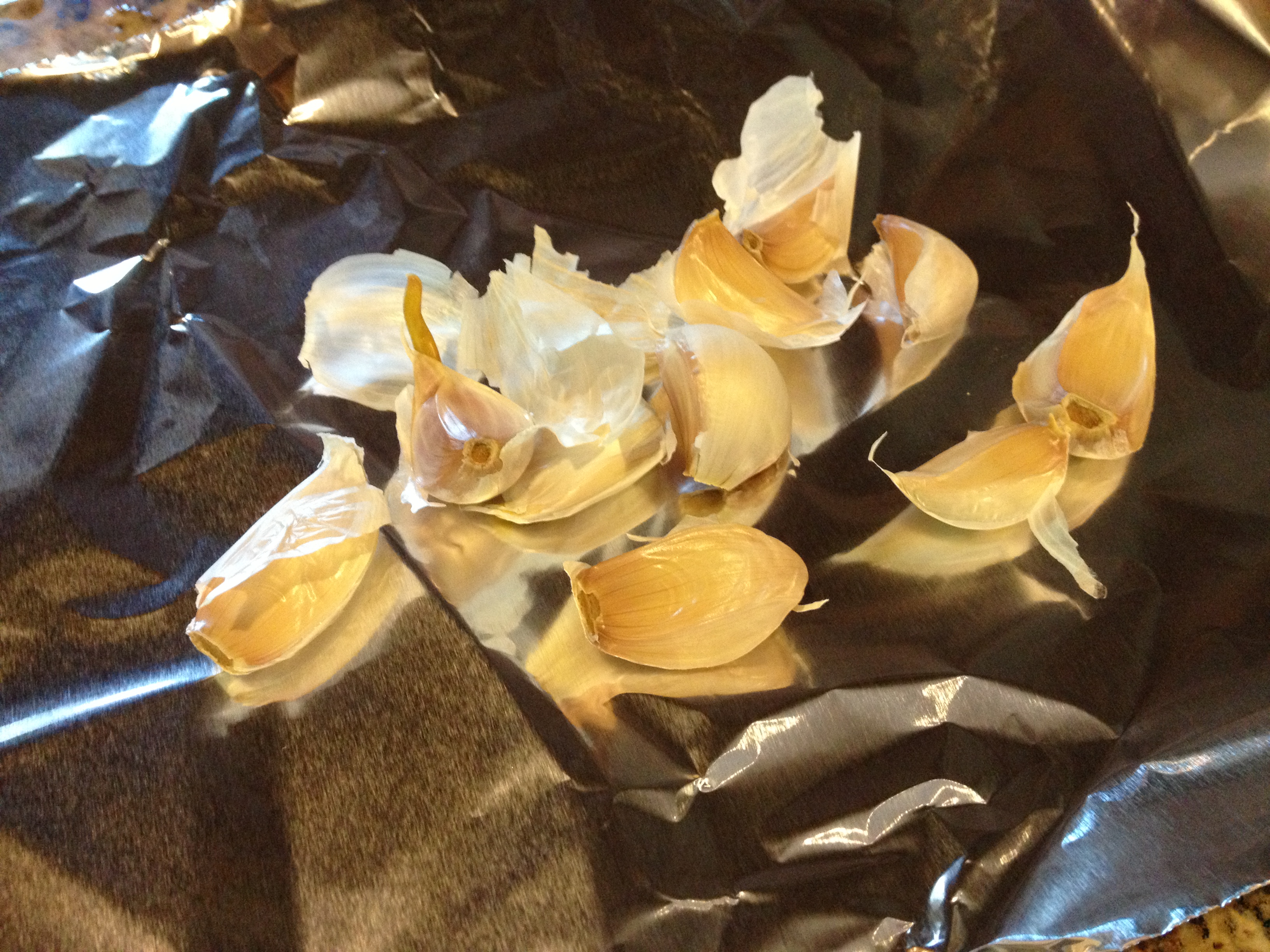 Separate garlic head into cloves, discarding the loose papery outer skin but keeping skin intact on cloves. Wrap in two separate pieces of foil crimping seams to seal tightly.