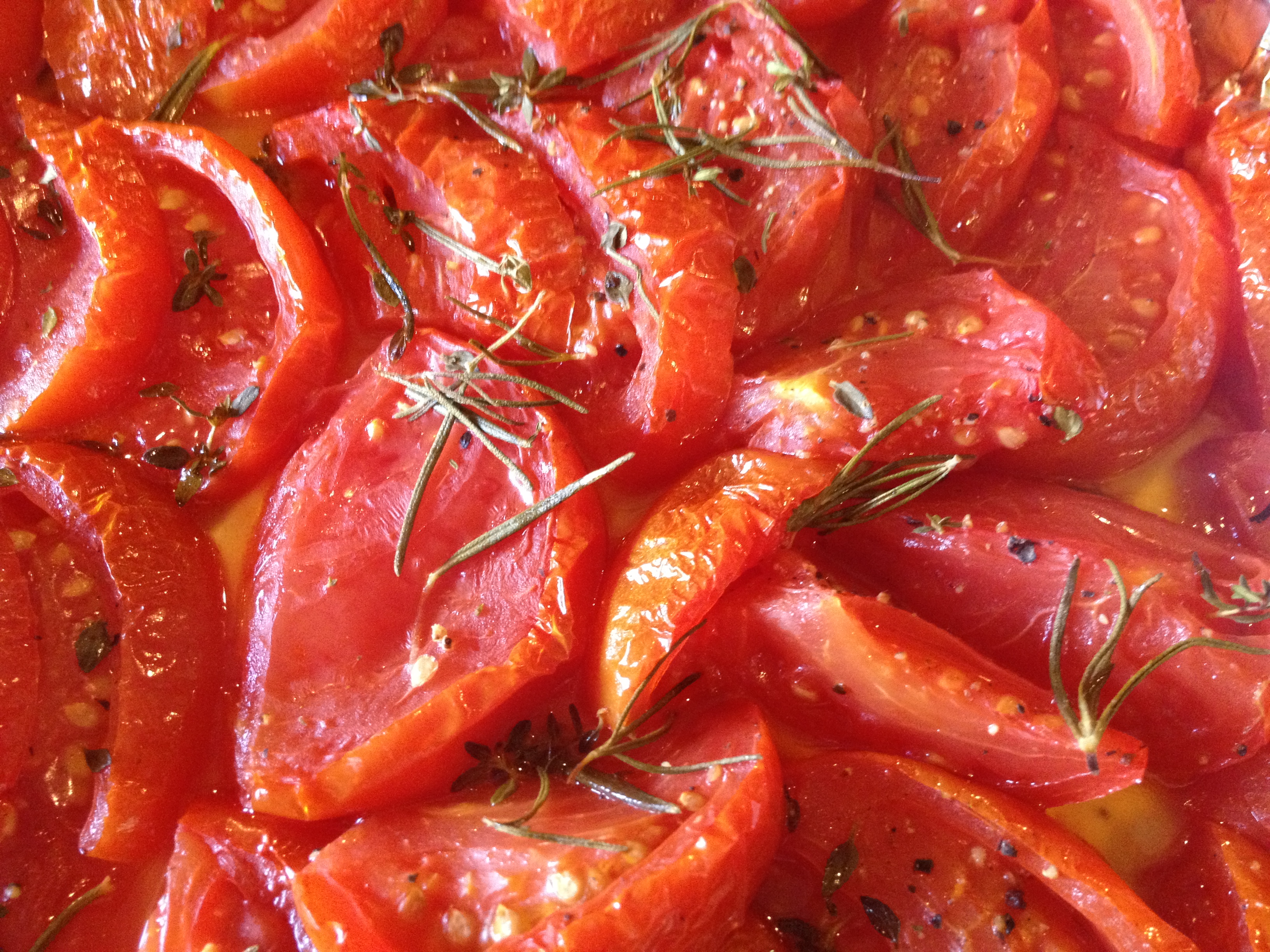 Core the tomatoes and then cut in two, top to bottom. Slice each half into 1/2″slices and arrange on the prepared pans. Sprinkle a tablespoon of rosemary and a tablespoon of thyme leaves on the tomatoes in each pan. Sprinkle the tomatoes with salt and pepper to taste.