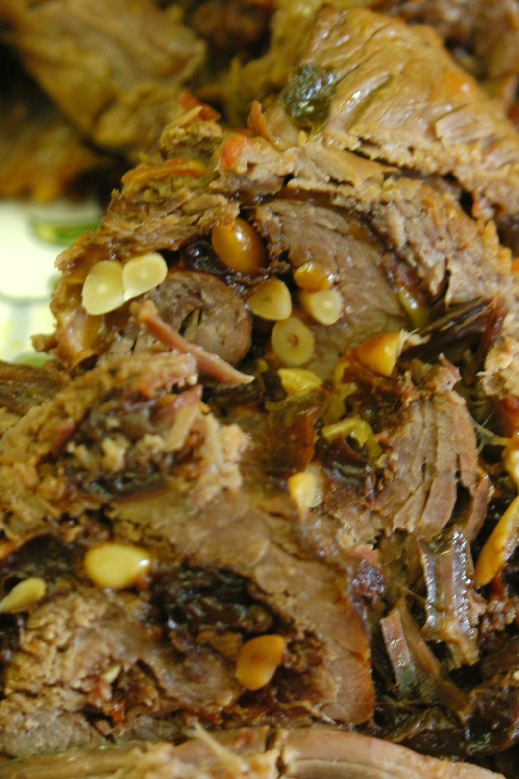 - Cover and reduce heat and cook until tender, about 2 hours, until the meat is tender. Alternately, place in a 350 degree oven. (Check periodically to turning the meat roll and making sure the sauce does not dry out. Add water if necessary.)