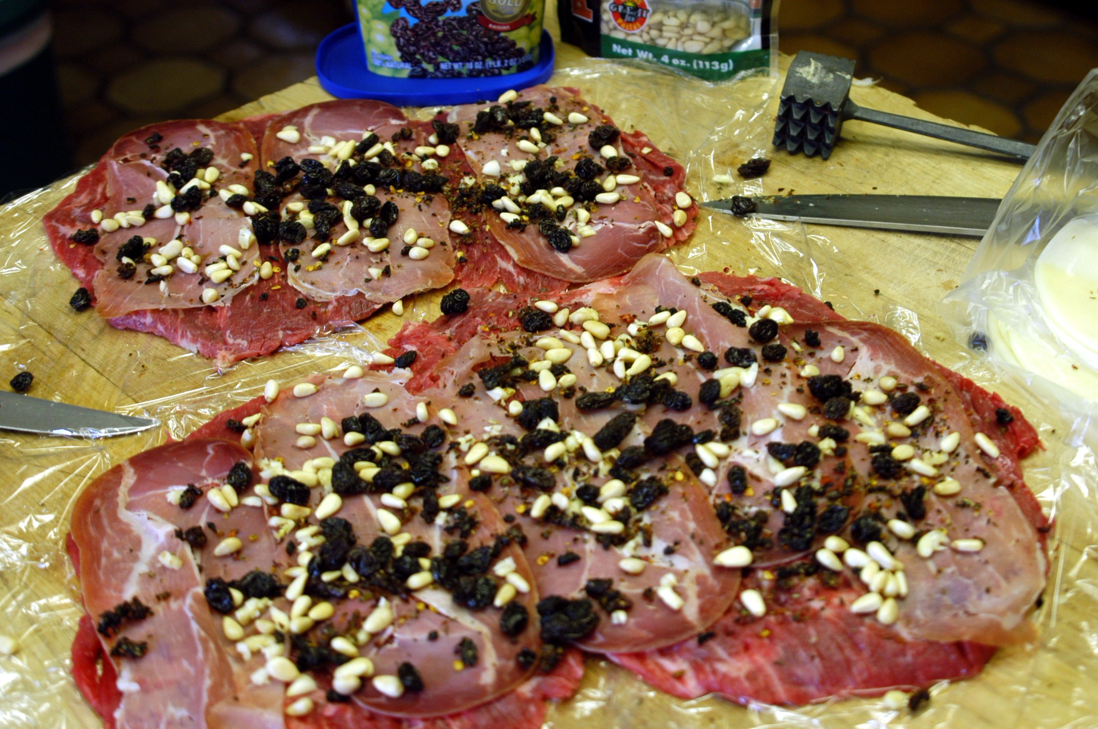 - Leaving a 1” blank space on the meat, sprinkle evenly with pine nuts, raisins, and garlic.