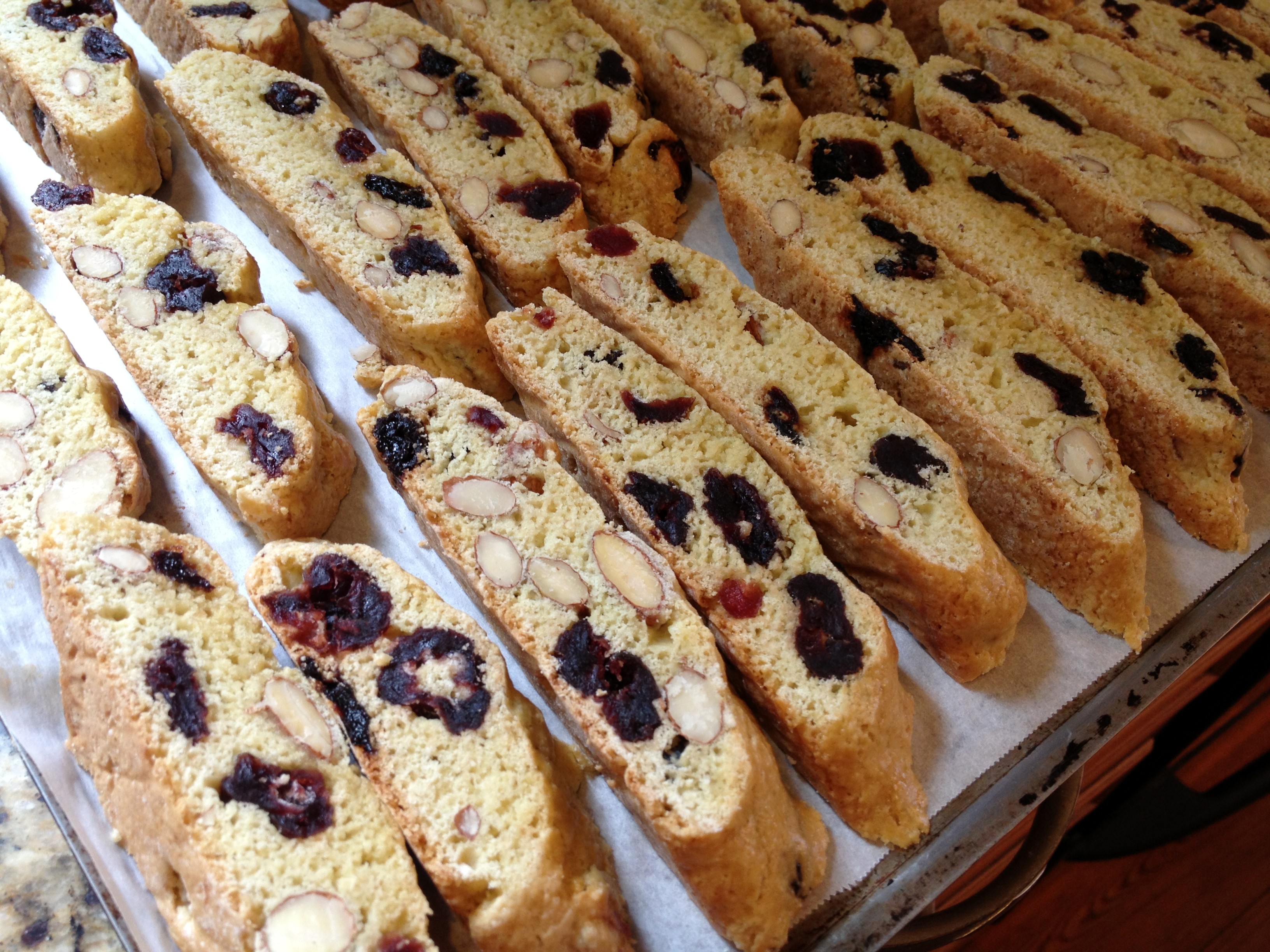 Making biscotti is a bit like making egg pasta – you incorporate the egg to the flour mixture and knead. It is a bit labor intensive because of baking, cooling, and then baking again…but, to my way of thinking, very worth the effort as the biscotti keep for a long time. They make great take-along snack as well.