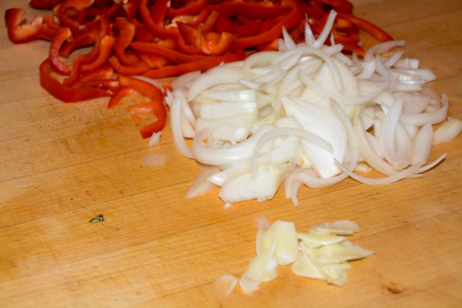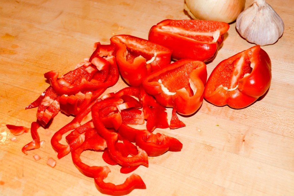 - 4 red sweet peppers, seeded and sliced in vertical strips