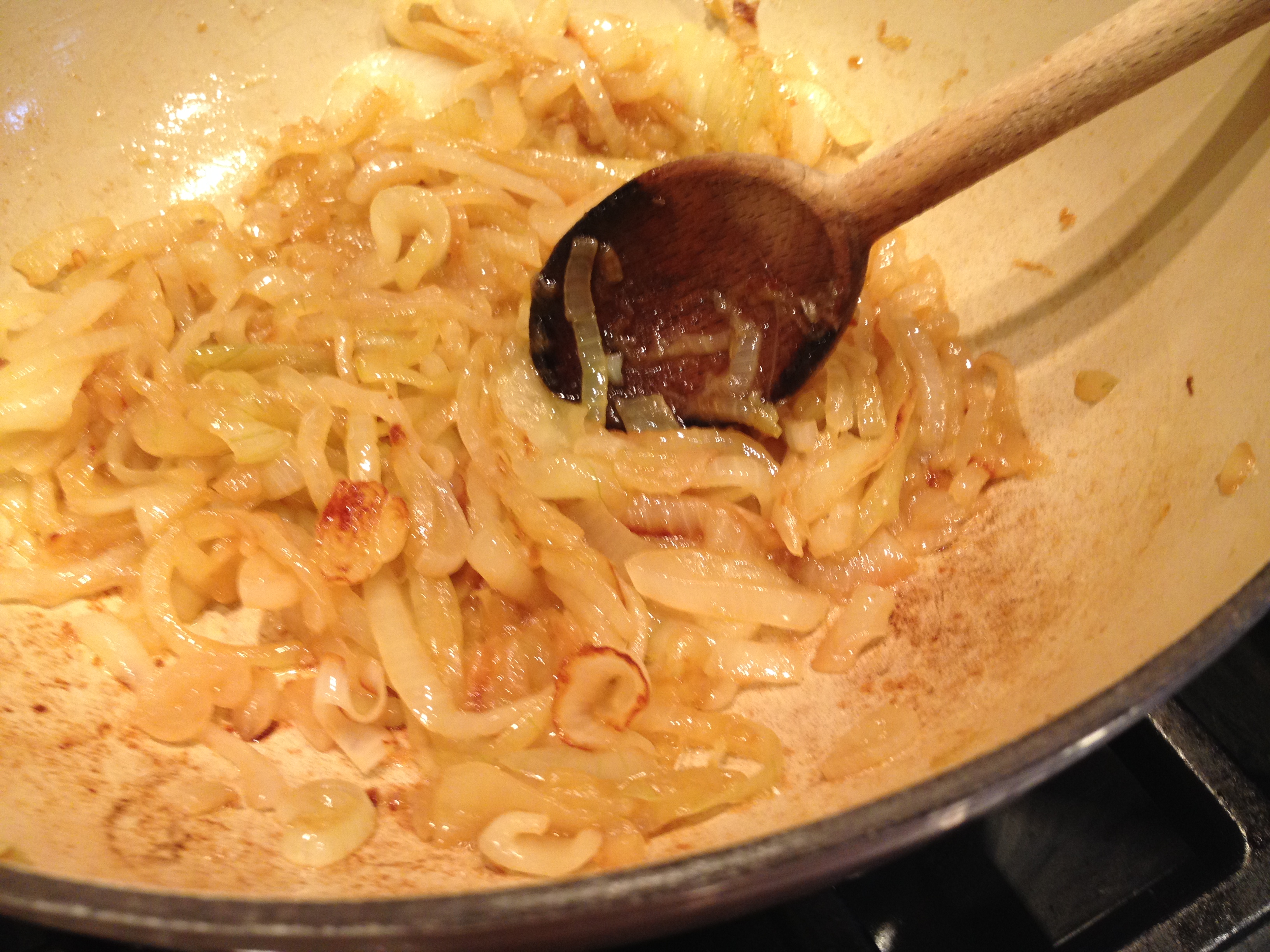 When the onions are a nice caramel color – they will be rather sticky – add the bay leaf and the spices, and mix them with the onions and garlic.