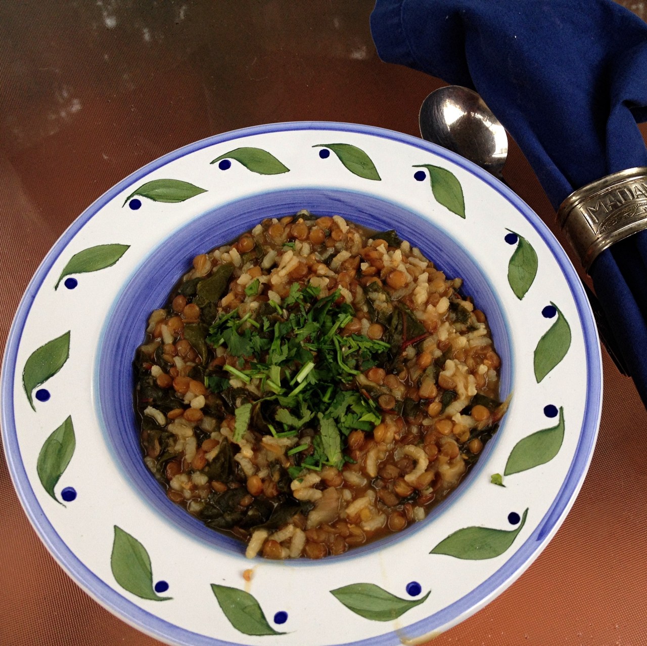 Basically all recipes call for combining lentils, onion, garlic, and either Swiss chard or spinach, and flavoring it with lemon.But other than that, the method in arriving at a soup or a vegetarian dish seems to differ from blogger to blogger as do the added flavors used. Finishing the dish with cilantro or with parsley? A lot of garlic or just a touch? Cooking the lentils in water and sautéing the onions and greens in a pan and then combining? Or simply (doing as I did!) using one pan? I suppose the reason I like traditional ethnic dishes so much is that variation from cook to cook that occurs while still being faithful to the concept.