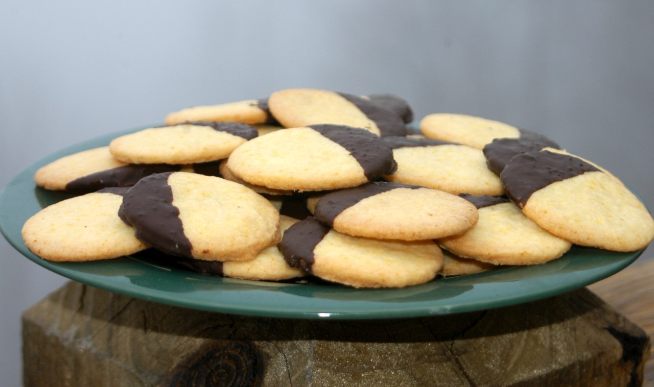 These showy cookies with a delicate orange flavor are best made into small rounds. They are adapted from a Willliams Sonoma recipe and work well in the winter when oranges are plentiful and chocolate won’t melt!