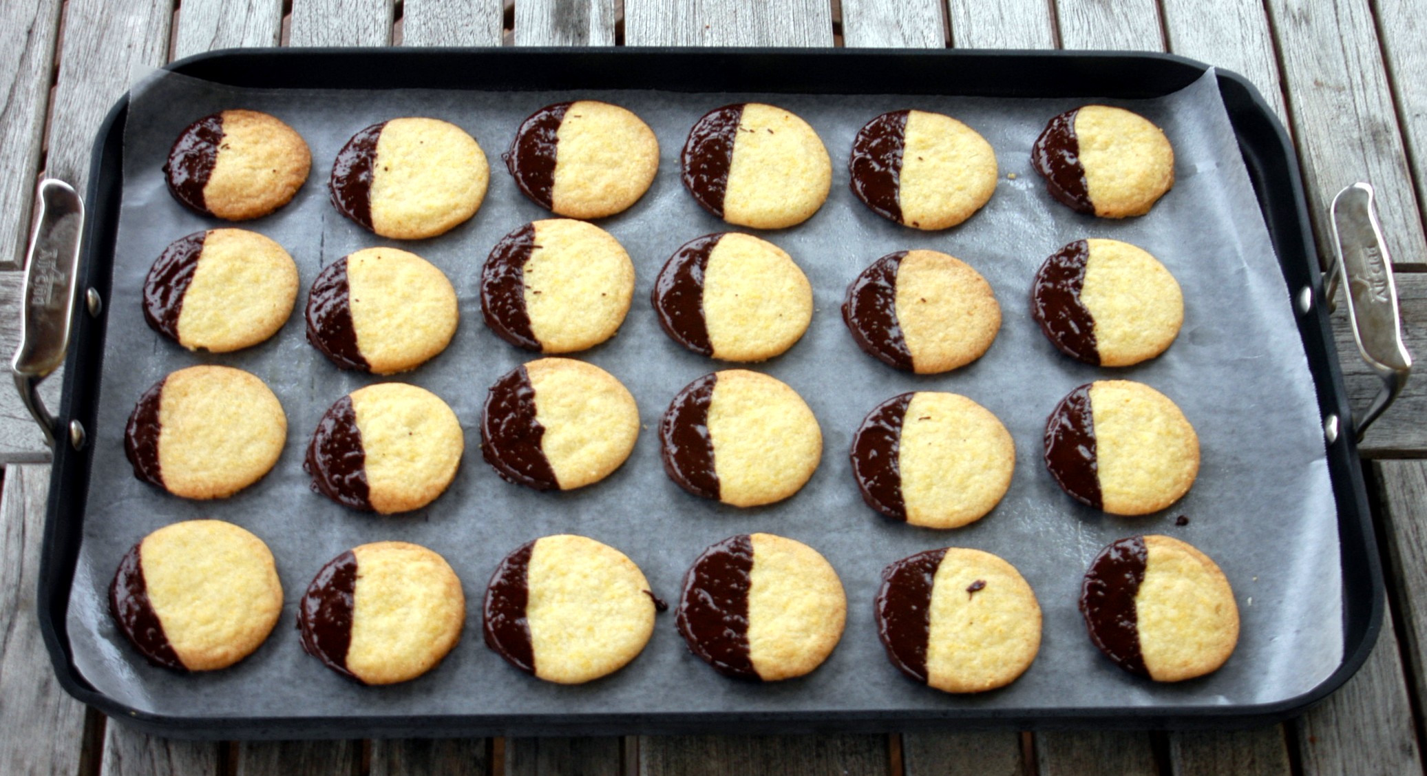 - Place the melted chocolate in a small bowl and dip the cookies into them covering them halfway. Tilt the cookies back and forth otherwise only one side tends to get covered otherwise.