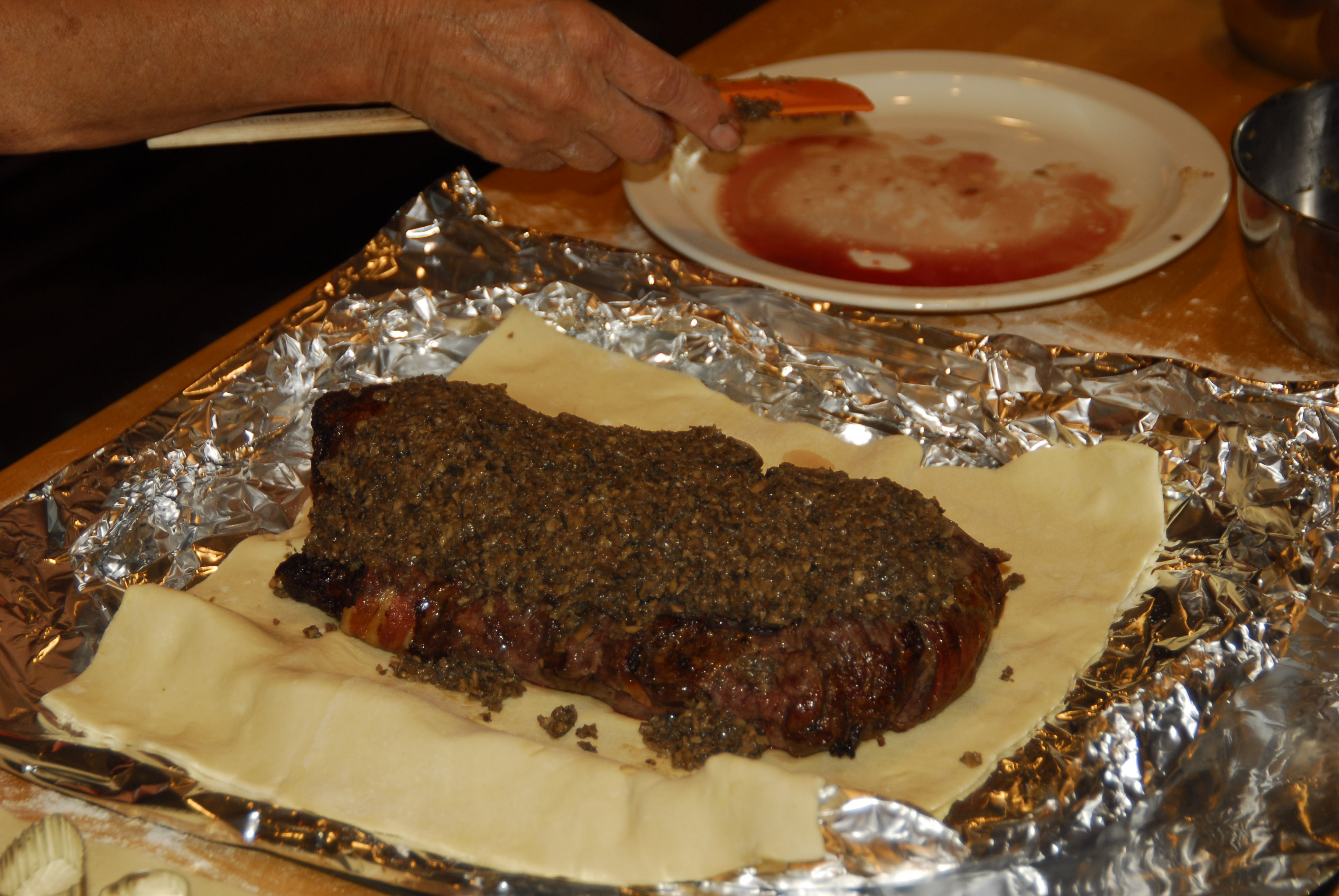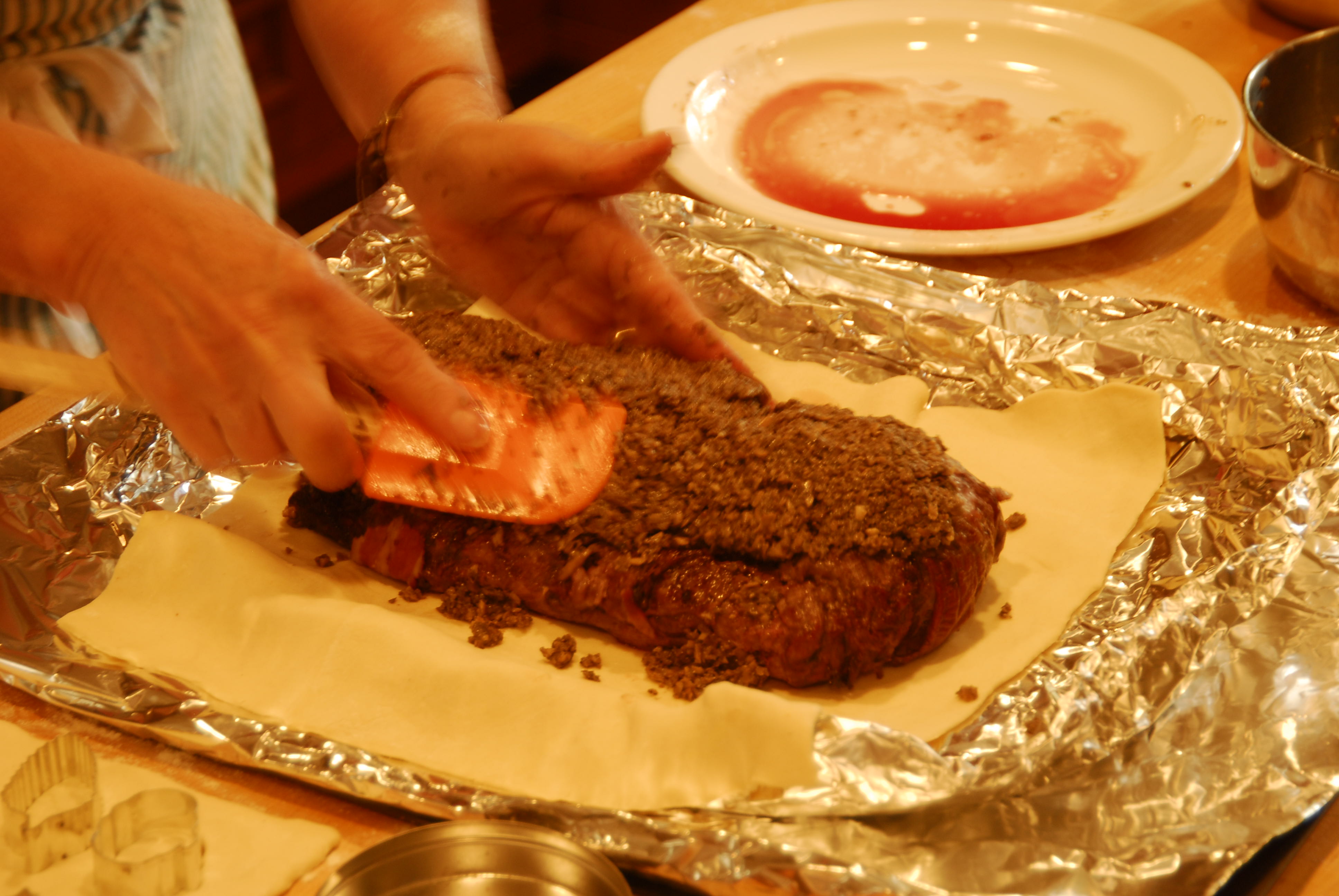 Place the fillet on the middle the duxelles covered pastry and bring each side to cover the roast. Seal with some of the egg wash