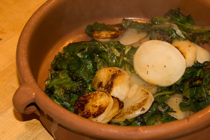 Add a few cloves of garlic, if you want, and salt & pepper. Cook them until they begin to caramelize a bit. If turnip greens are included in your purchase, wash them well, cut them up, and add them to the pan once the turnips are almost done.