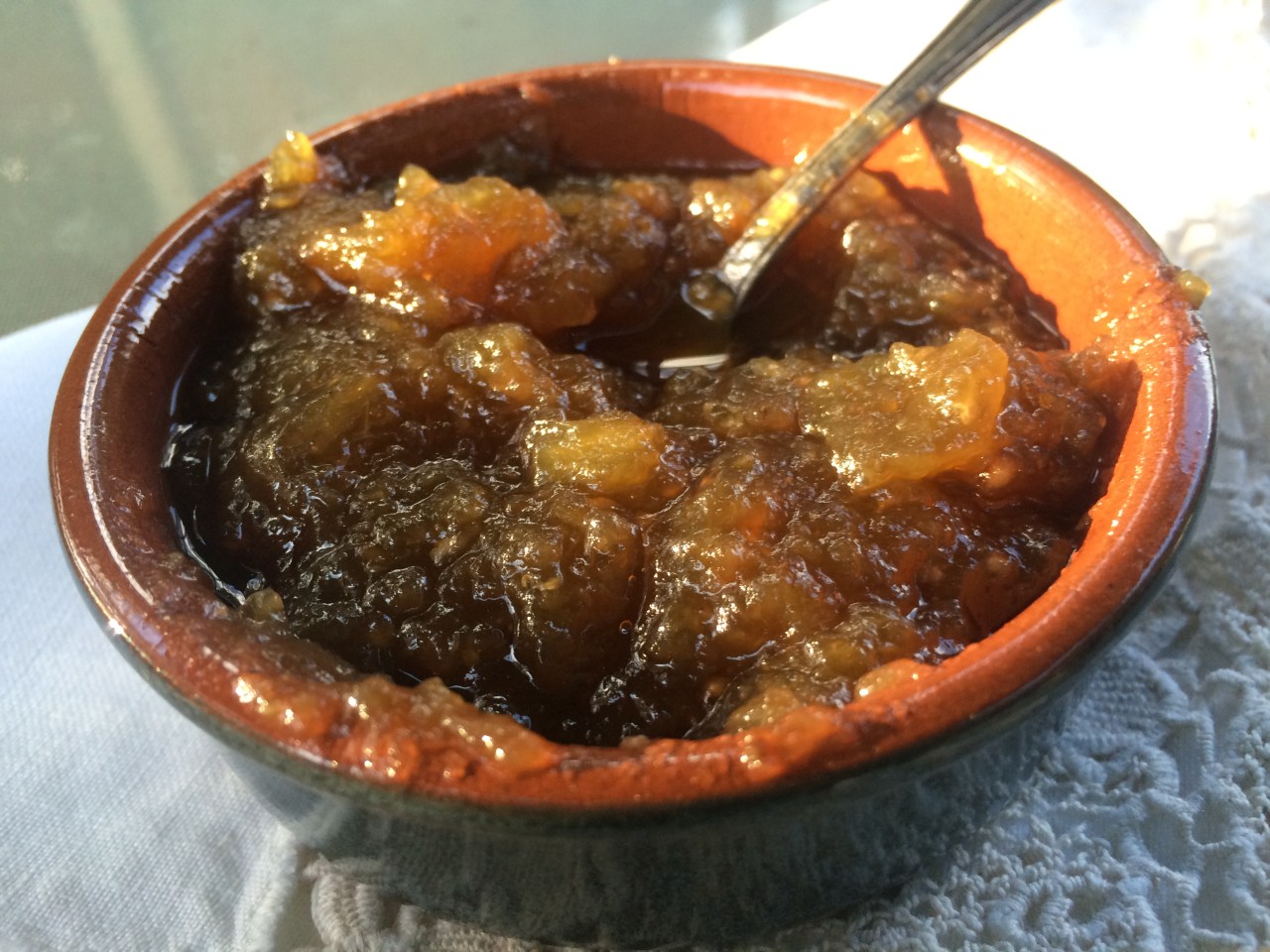The marmalade is done and sampled, and declared yummy. I felt it needed a little oomph so I added some lemon juice at the end and proceeded to my smart phone to see if anyone else made ” mermelada de berenjena” or eggplant marmalade/jam. I DID find recipes, both in English and Spanish – did not check Italian sites, and both Spanish-speaking and English-speaking cooks seemed to add lemon juice and spices – cinnamon, vanilla, etc., but I tend to be a purist when it comes to marmalade and think the eggplant marmalade experiment turned out just fine. I did not can the results, as my 3 pounds only yielded about 4 1/2 cups of marmalade, so next time I will make 5 pounds at a time which will yield about 6 cups of marmalade and make it worth a canning run.