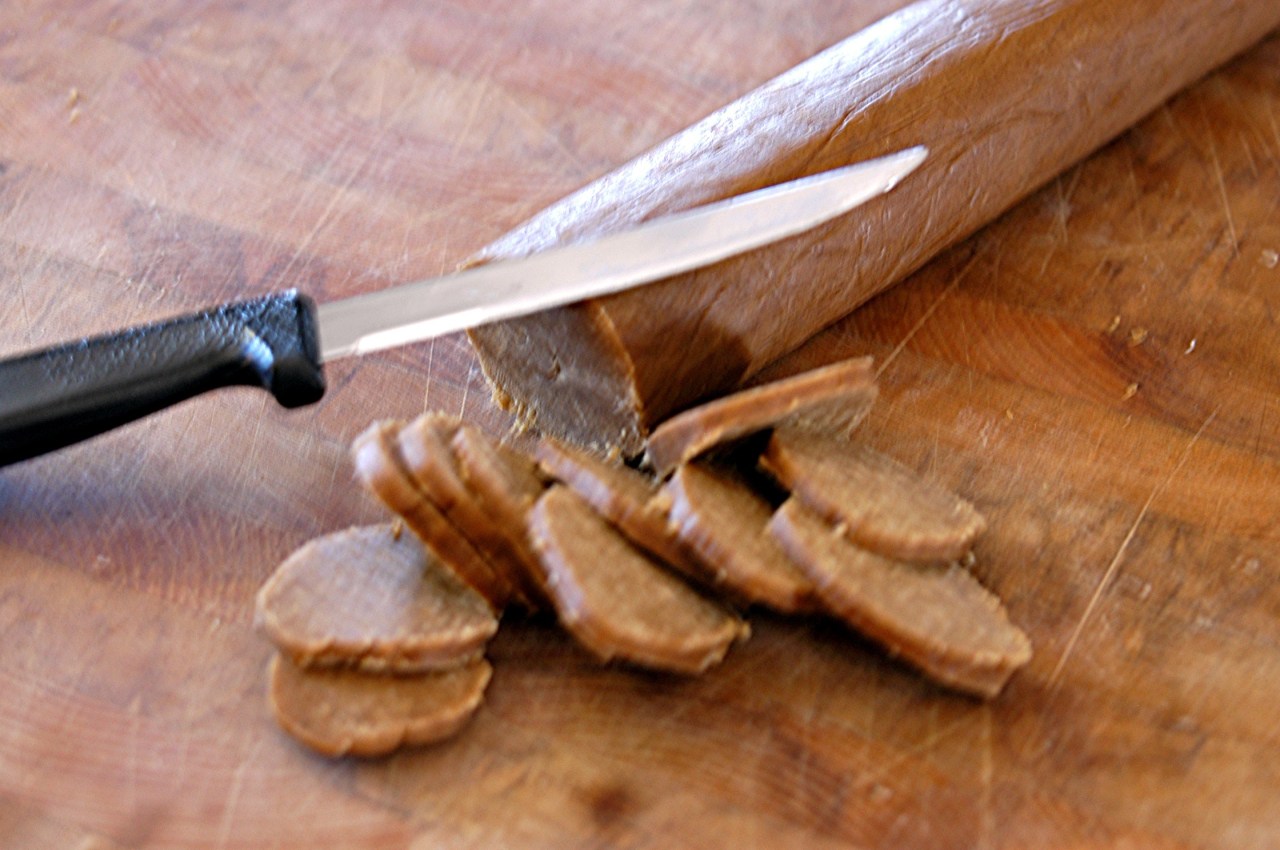 Once I am ready to slice and bake the cookies my frustration has been that I have a hard time cutting the dough uniformly. Furthermore, although I try to make sure that my knife goes down 1/8, or ¼ inch apart, invariably the top is fine but the knife seems to slip down at an angle. To counteract this sort of problem, a suggestion is to: