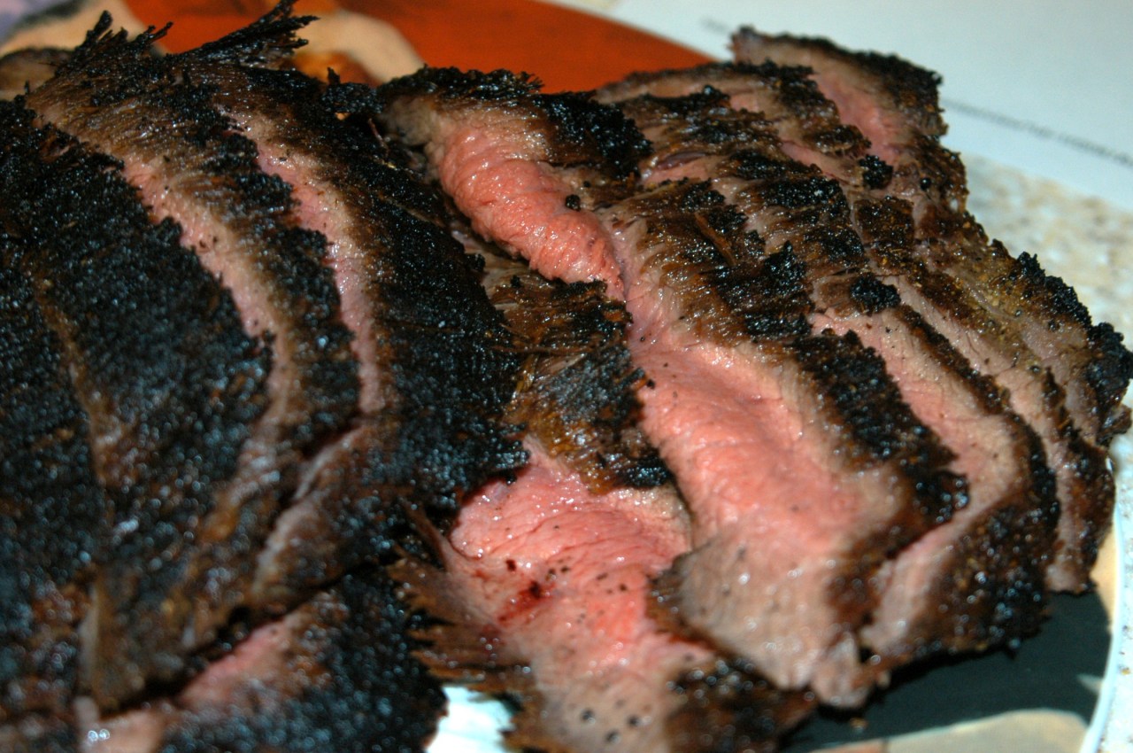 Flank steak is low in calories (43 per ounce, raw), rich in protein, and versatile. It is a muscle found on the lower tummy of a cow and can weigh from ½ to 1 ½ pounds. The main claim to fame for this cut is that it grills well and quickly. It can be dressed up many ways and makes a quick company dinner. One of our favorite ways of preparing flank steak is to use a rub on it, let it “marinade” for about a couple of hours, and then grill it.