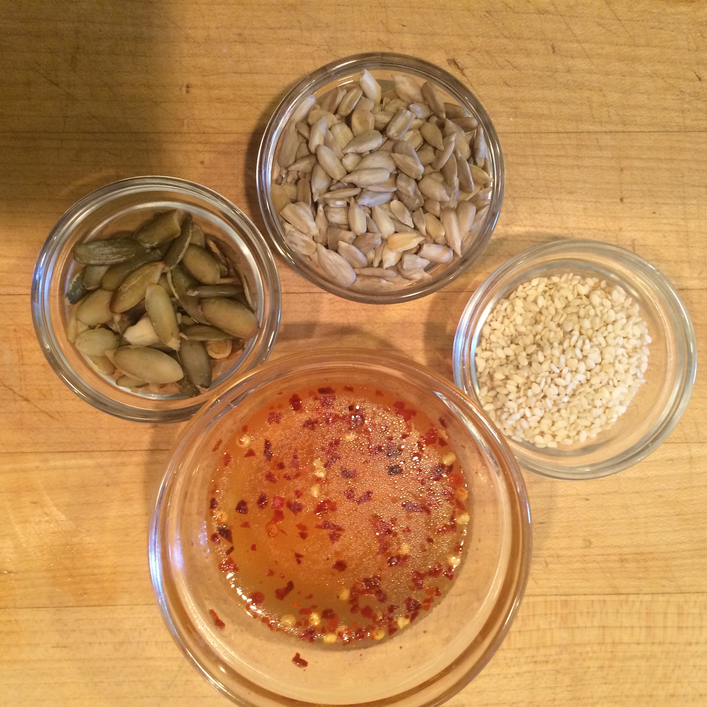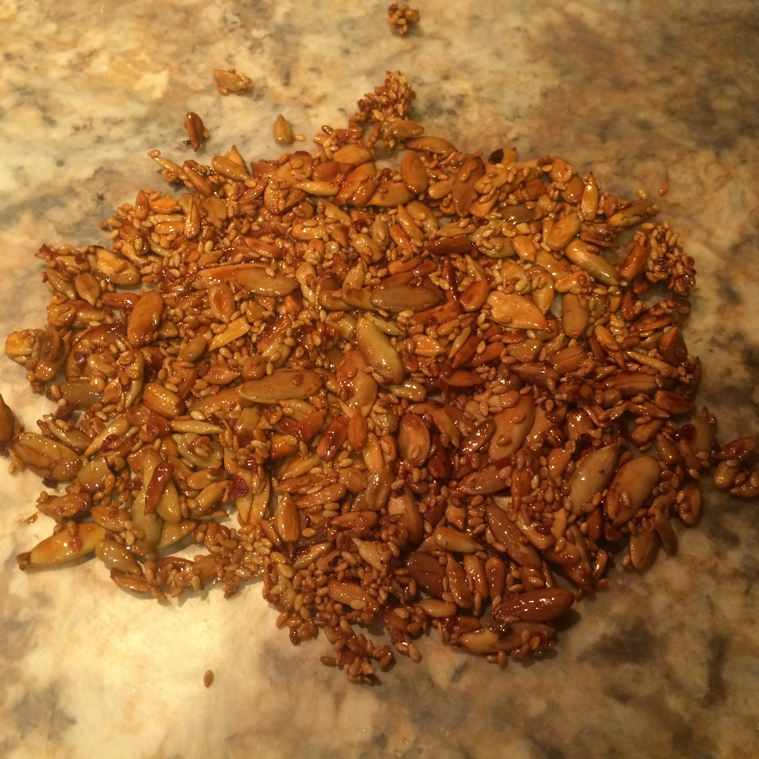 We’ve enjoyed a kale salad that included seed brittle at a local upscale restaurant several times but didn’t think of making the it at home. Then, a couple of months back, Bon Appetite magazine featured the recipe pairing it with collard greens. Ok, folks, that was too much for me. I HAD to try making the brittle. The recipe called for Aleppo pepper which is a Middle Eastern capsicum. I substituted crushed red pepper, but toned it down by half because the Aleppo pepper (named after the Syrian city of Aleppo) is milder.