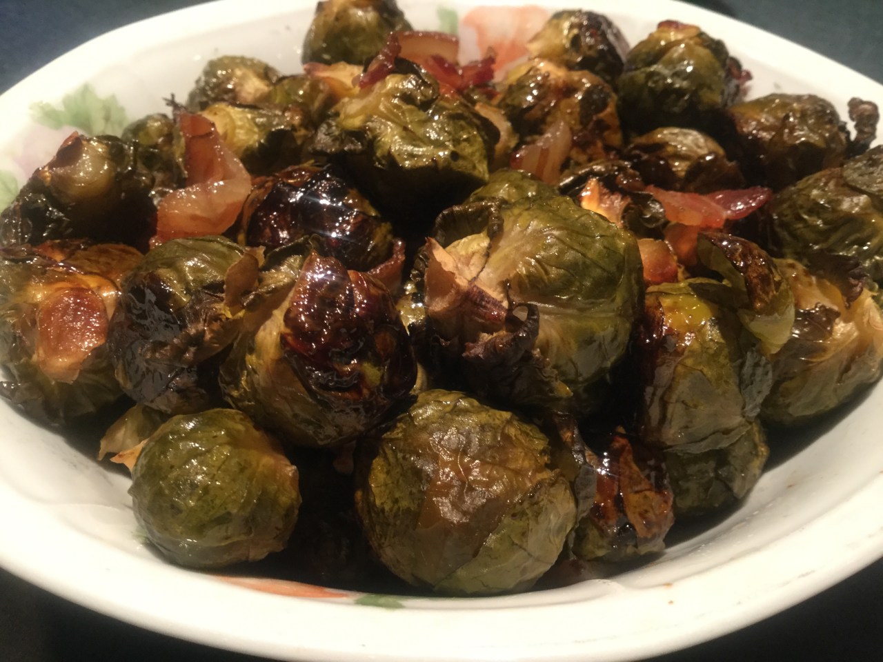 This recipe is a knock off of Brussel sprouts we have had at The Bodega, a local Tapas restaurant in Orlando, Florida. I love the sweet-saltiness of it. There are no proportions given in the recipe because it depends on how big the dish is. I usually make a stalk of fresh sprouts, or buy a package of sprouts and use 2-3 pieces of bacon. No need to use oil in the pan as the bacon yields enough fat so that the dish does not burn. – as described in the directions, you can either bake the sprouts in an oven proof dish or simply line a ridged baking sheet with foil. It will save cleanup time