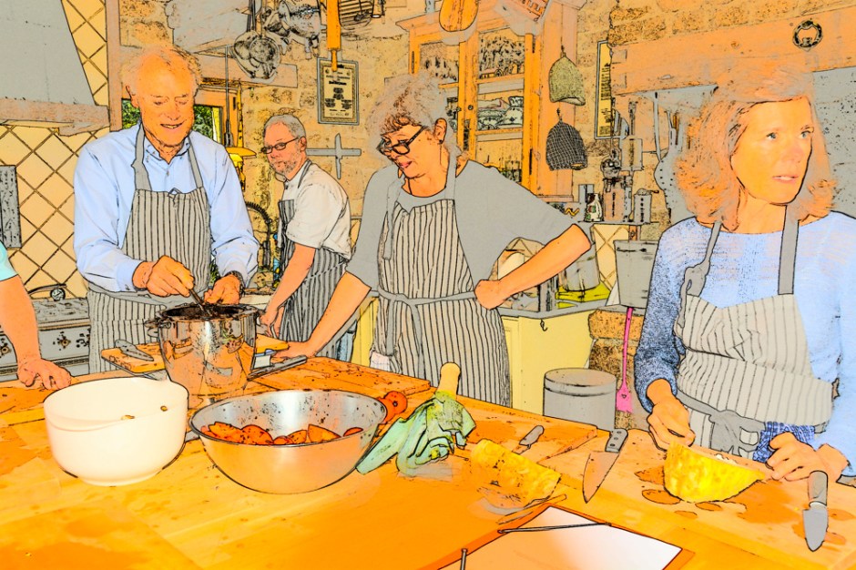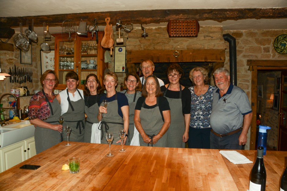 We had reason to be proud of ourselves. We had met every morning and every afternoon preparing lunch as well as dinner. Each meal was composed of three courses – a starter, a main dish, and a dessert. There were many dishes, many preparations, and many chances to improve our skill in the kitchen with instructions from Chef Paul (wearing the apron).