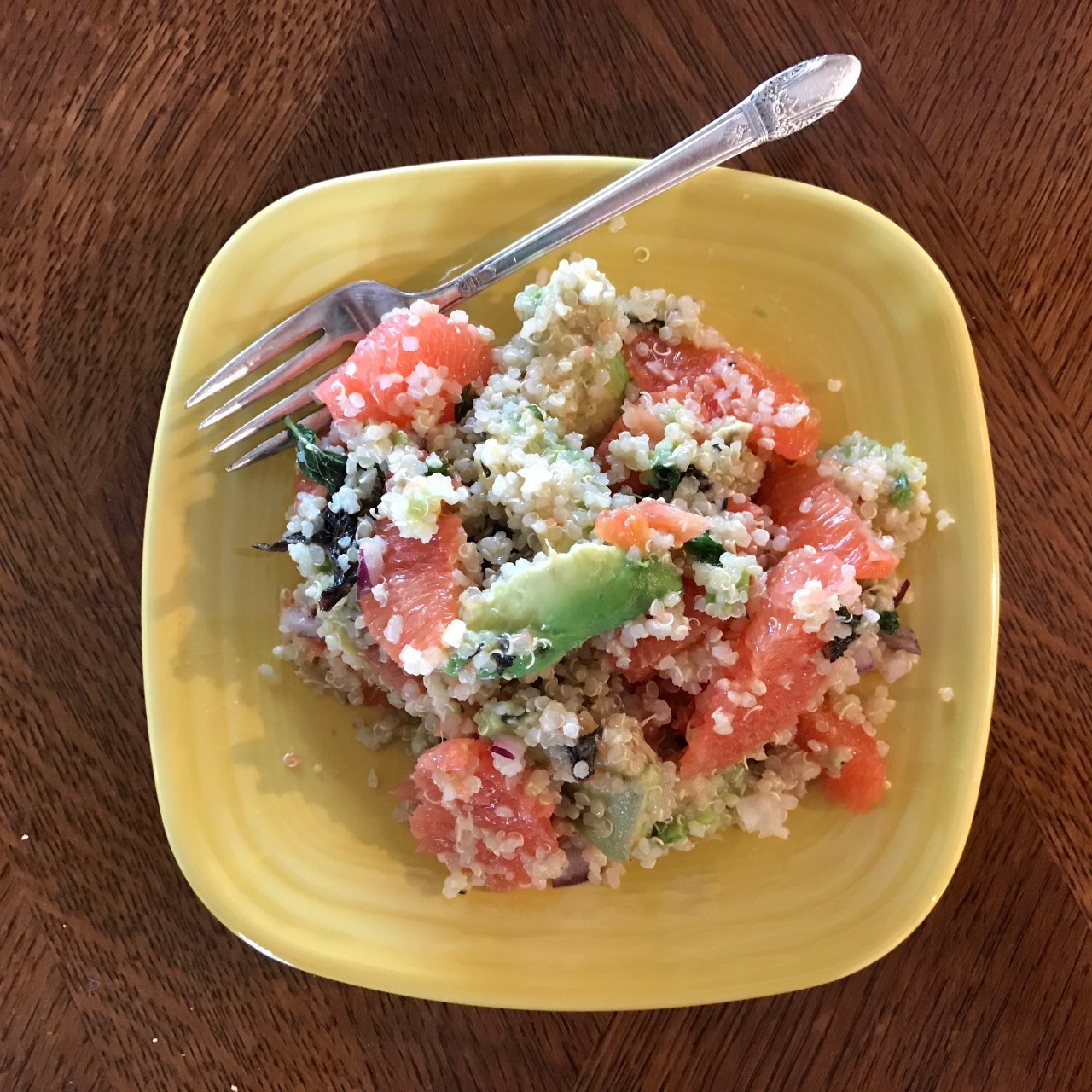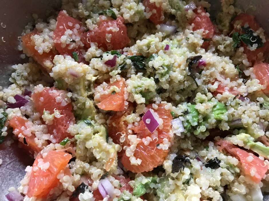 - Add the quinoa, the chopped onion, the chopped mint, and the sliced avocado. Stir.