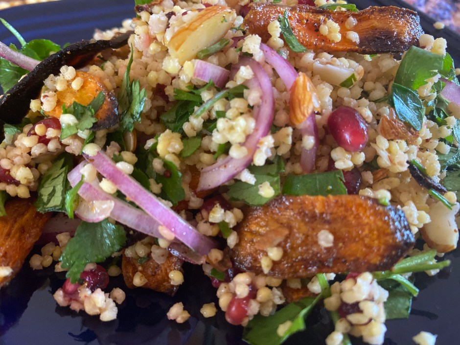 Combine the carrots, millet, red onion, almonds, pomegranate seeds and herbs. Toss with the juice of a lemon and 2 tablespoons olive oil.