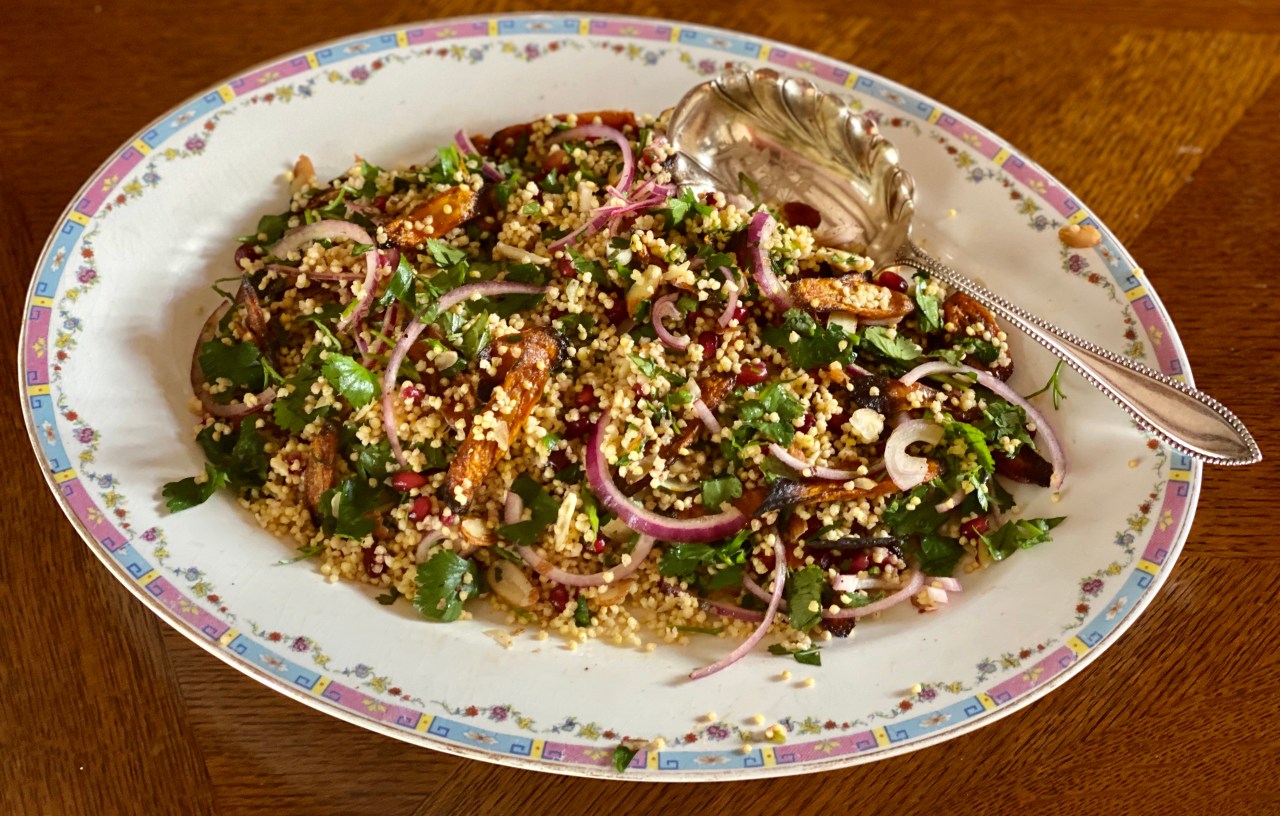 Combine the carrots, millet, red onion, almonds, pomegranate seeds and herbs. Toss with the juice of a lemon and 2 tablespoons olive oil.