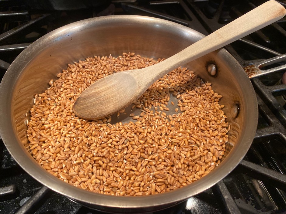 In a medium saucepan, over medium heat, toast the farro until it starts popping. Immediately, add water. Toasting the farro imparts a nice, nutty flavor.