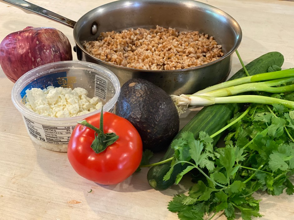 - While the farro is cooking, Cut the cucumber, tomato, avocado into 3/8” dice. Chop the red onion, scallions, and the cilantro.