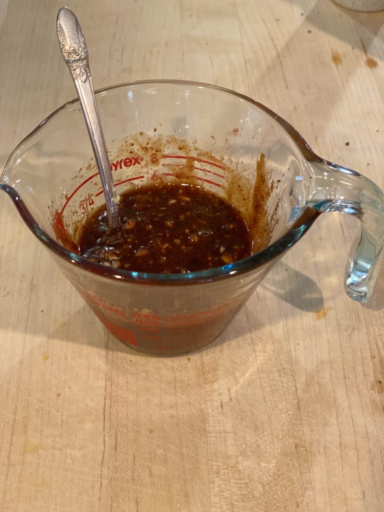 Combine the sugar, syrup, mustard, thyme leaves, garlic, and chili powder and stir to mix.