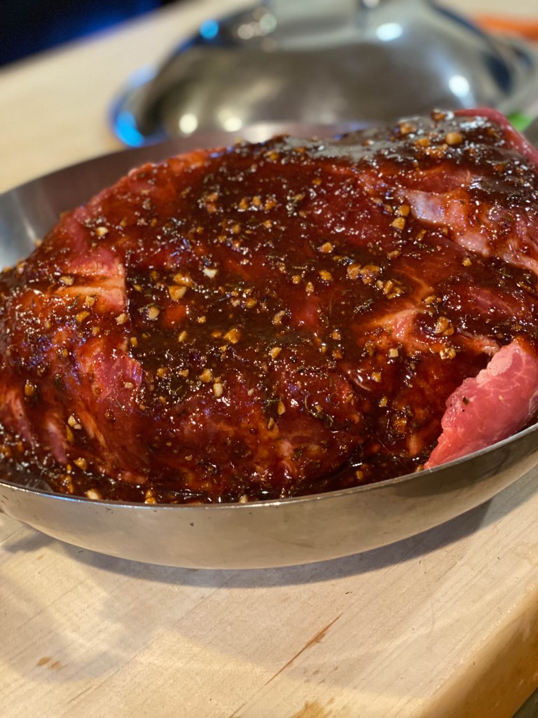 I was trying to strategize how to organize myself for a week of home cooked meals when I noticed a book by Amanda Hesser and Merrill Stubbs, A New Way to Dinner with the tag A playbook of recipes and strategies for the week ahead. In perusing the book I found a recipe which, lazy me, was just my style. It is “Overnight Roast Pork”, page 165.