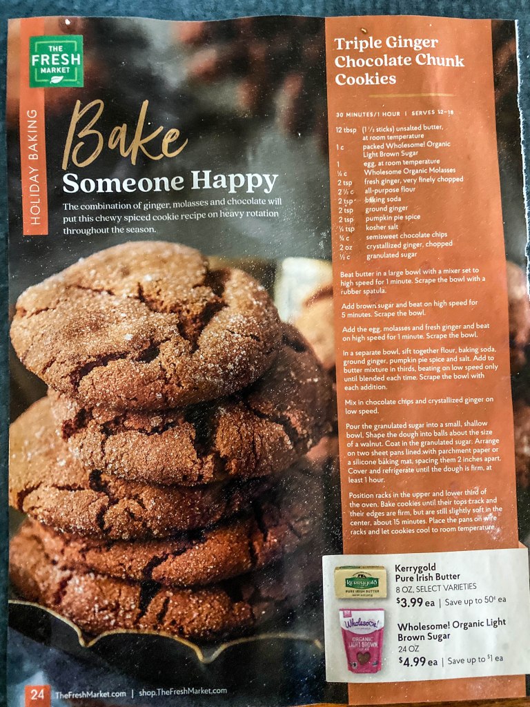 A Seasonal Treat -Have you ever gotten a flyer from a local grocery store and deciding that, yes, you WOULD try that recipe? That is exactly what I did. There is a small chain of markets in our region which always manages to carry items that brighten the holiday season. As it happens, both in Asheville and in Winter Park we have a Fresh Market. I looked through a flyer I received from them and saw this page – Bake Someone Happy. I thought it was pretty clever but wondered if anyone I knew liked ginger as much as I did. I followed the directions, but one thing that puzzled me was that there was no mention of oven temperature. I baked the cookies at a 375 degree oven. The recipe (below) said to bake the cookies in two racks of the oven. However, when I did I noticed that the cookies baked on top were nicely crinkled, but the ones in the bottom were not. I recommend not baking the cookies together but to bake them in two batches in the middle of the oven. Other than that, Thanks to whoever at Fresh Market thought this one up!
