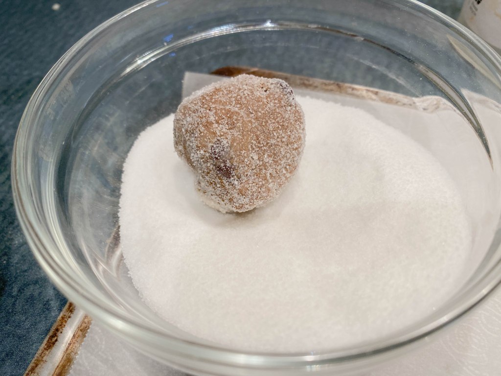 Shape the dough into balls about the size of a walnut and coat with granulated sugar.