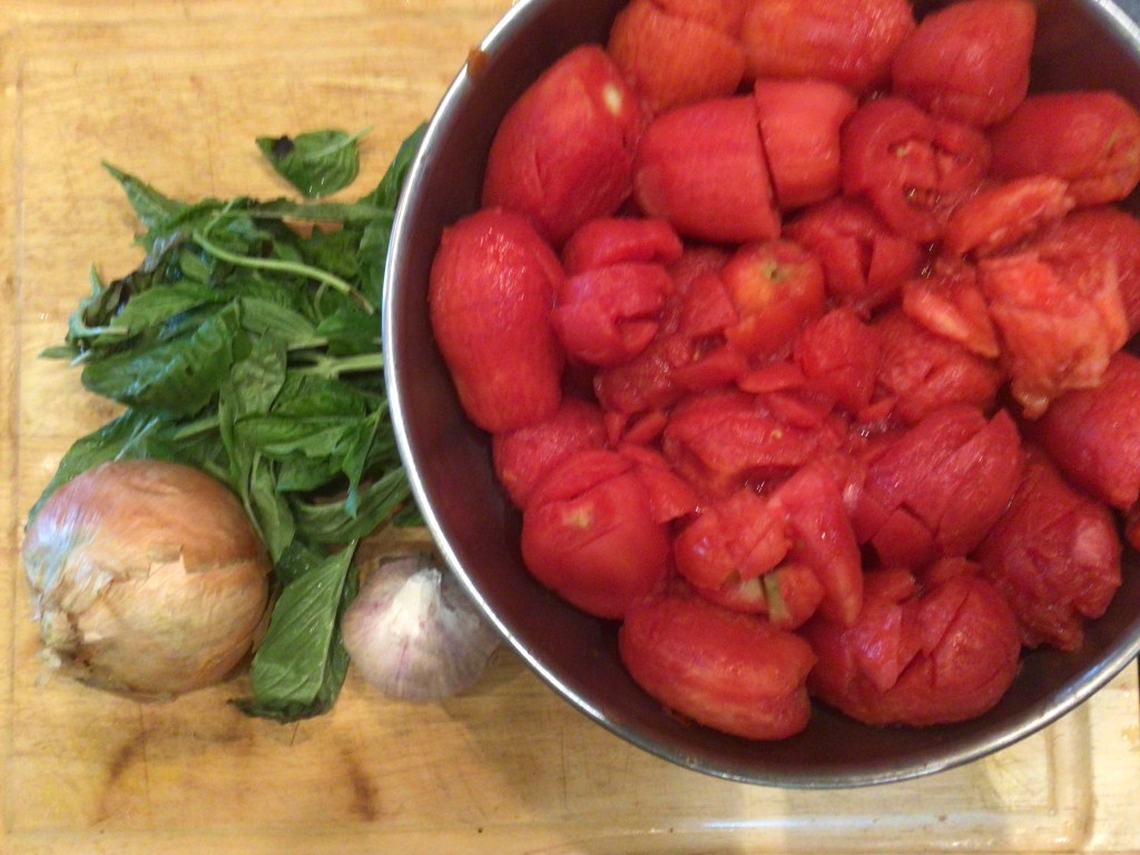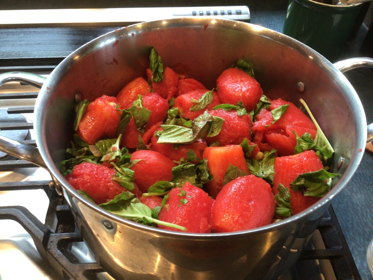 - Add the tomatoes, the roasted garlic, and the basil.