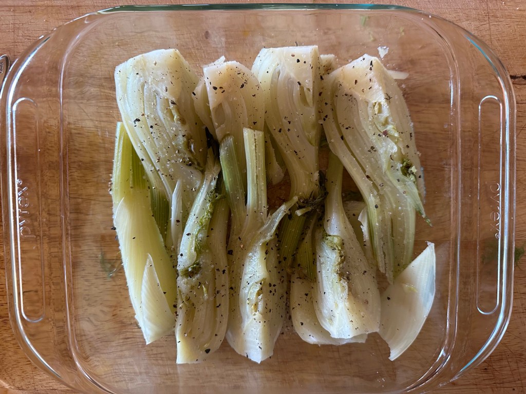 - Remove the dish from the oven and place the pieces of fennel side by side in the casserole dish.