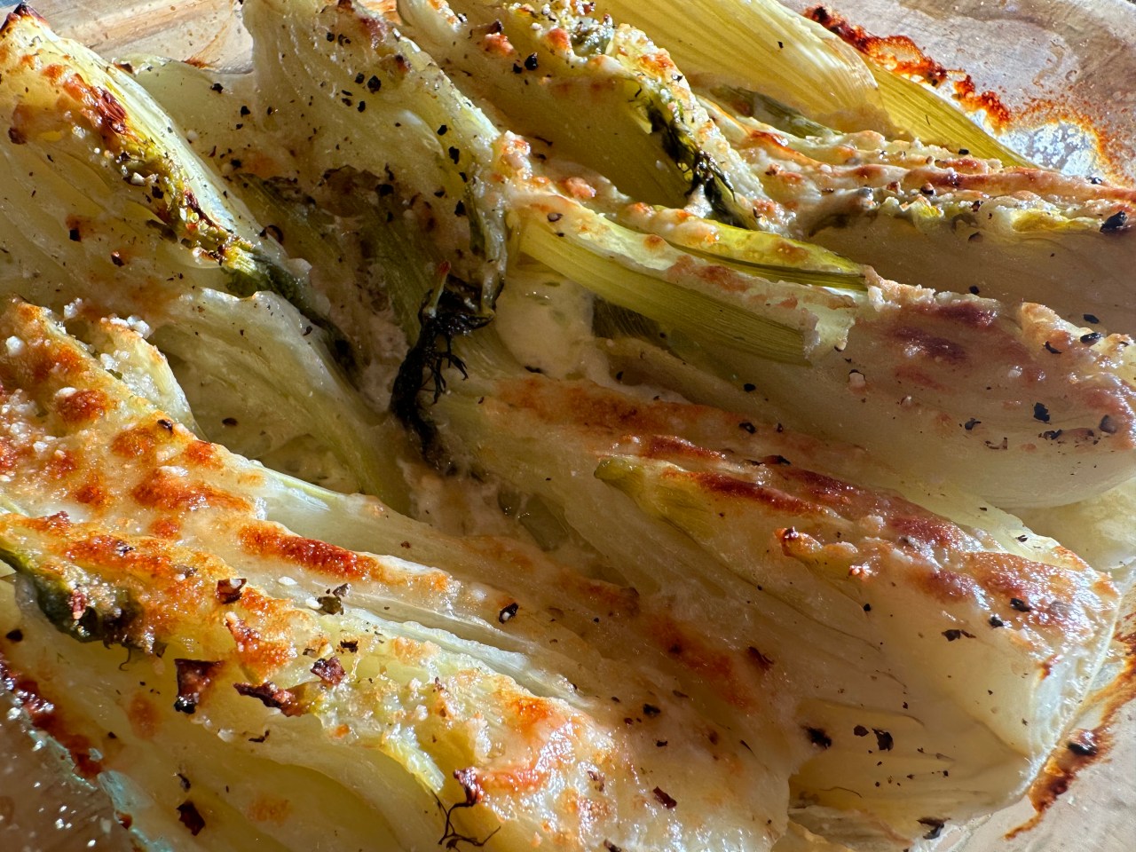 - Bake, uncovered at 400 degrees until the cheese is brown and the fennel is cooked through. (about 30 minutes)
