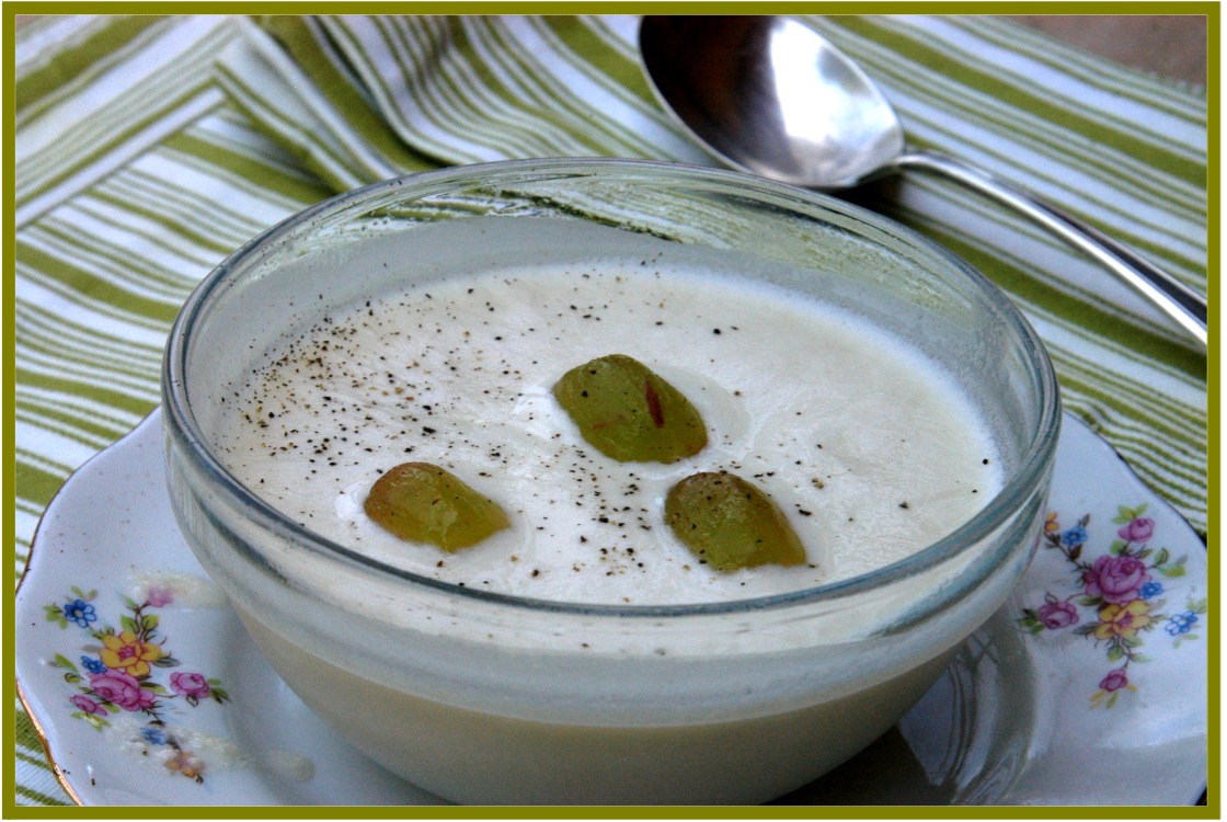 This soup is also called Gazpacho Blanco or Gazpacho Malagueño as it is typical of Malaga as well as the region of Extremadura. There is quite a discussion in sources of the history of gazpacho as well as its etymology. Gazpacho, it seems, originated in modest, humble households of fishermen or shepherds as they crumbled up bread, added oil, liquid and whatever else was at hand. A poor man’s subsistence diet that evolved into interesting summer soups – the most known of the variations is the Gazpacho Andaluz made with a base of tomatoes.