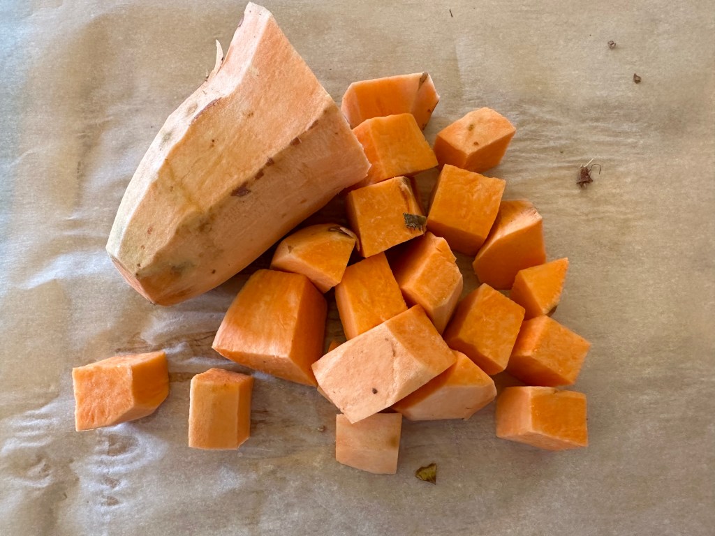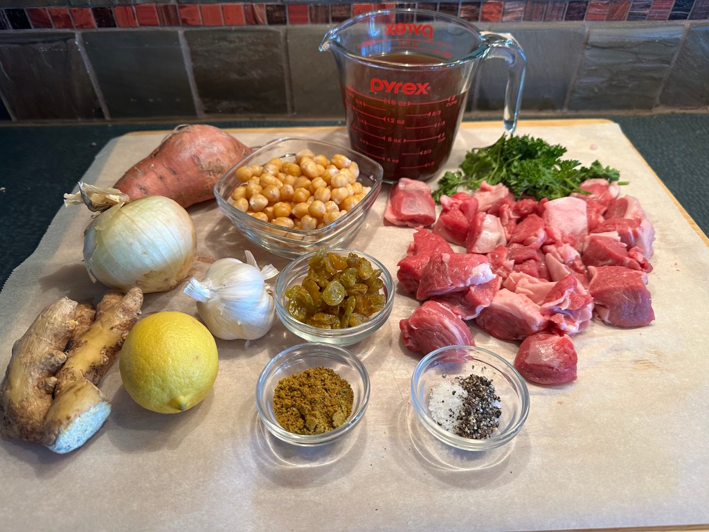 Several of the recipes called for dates or dried fruit to be added to the stew. The sweet potatoes add the same sort of sweetness. If cooked along with the lamb, they will be soft, so if firmer sweet potato pieces is desired, they could be added after the meat cooks for a while. As it is, the garbanzos add a nice crunch which contrast with the soft sweet potatoes.