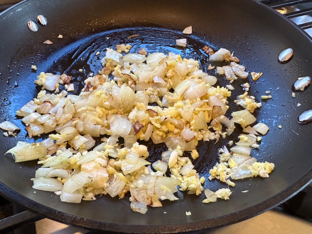 Add chopped onion and cook to soften and slightly brown. Add the minced garlic and ginger room and sauté for a minute longer