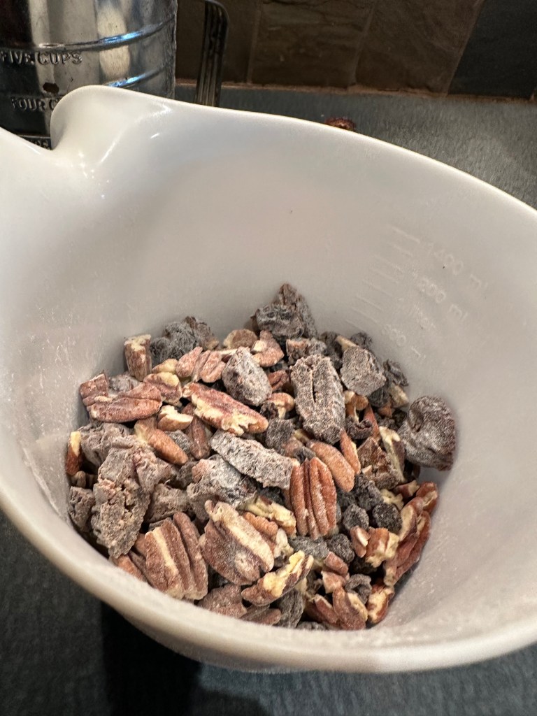 Dust the raisins, dates, and nuts with the ¼ cup flour. Stir into the pumpkin bread mixture.