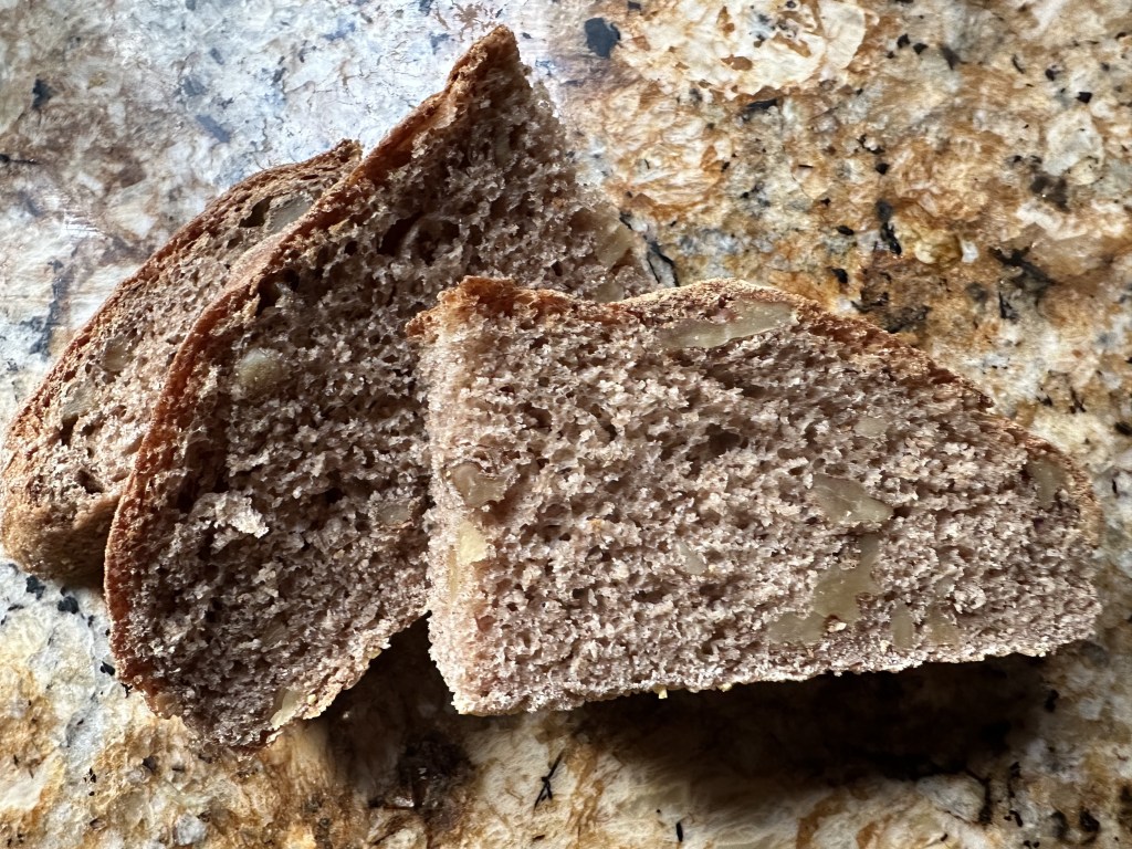 These are slices of the walnut bread I cooked using Rouge de Bordeaux, with its pronounced crust and reddish brown color.