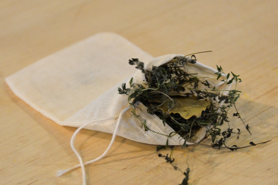 - Put the bay leaves and thyme in a small bag or tie with kitchen twine for easy removal