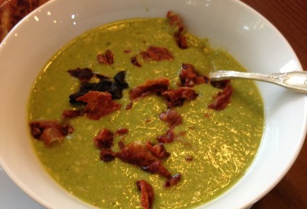 Cream of Green Pea Soup with Prosciutto and Parmesan